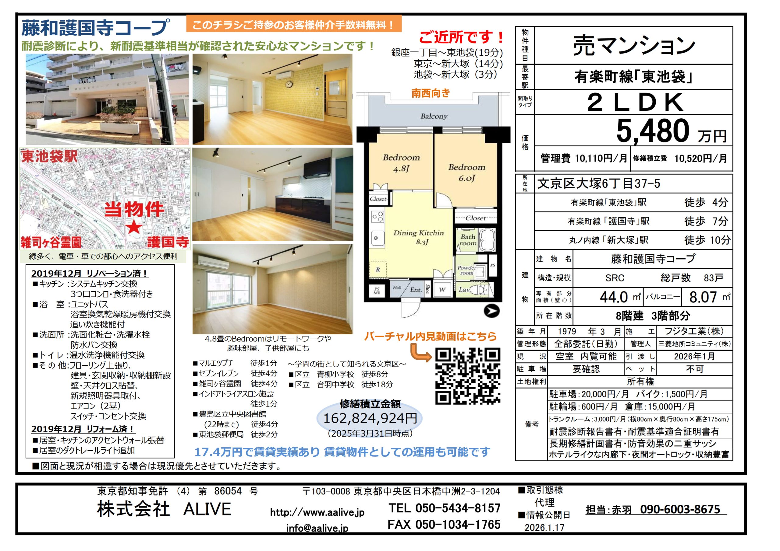 | 備考 | 修繕積立金総額:162,824,924円(2025年3月31日時点) 駐車場:20,000円/月(要確認) バイク置場:1,500円/月 駐輪場:600円/月 倉庫:15,000円/月 トランクルーム:3,000円/月(横80cm×奥行80cm×高さ175cm) ペット:不可 現況:空室 引き渡し: 2026年1月以降(内見は現在可能) 夜間オートロック、ホテルライクな内廊下設計 1階に保育園あり(さくらさくみらい 護国寺) |